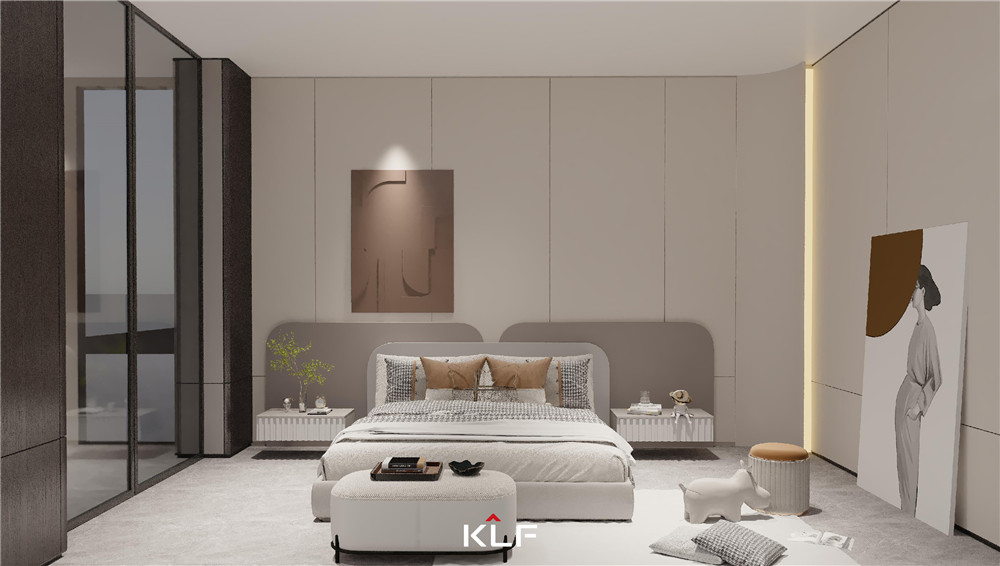 臥室空間摒棄傳統(tǒng)木門分隔空間的設(shè)計(jì),以360度旋轉(zhuǎn)中軸門分割共同與私密空間;床頭背景板皮革全包,更顯家居質(zhì)感;圓柱形床頭柜形體新穎,床尾凳舒緩物品放置壓力,滿滿的設(shè)計(jì)智慧。